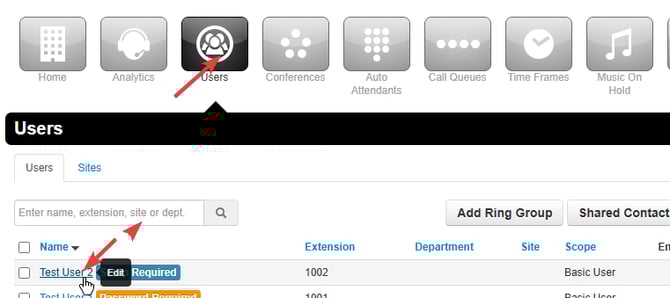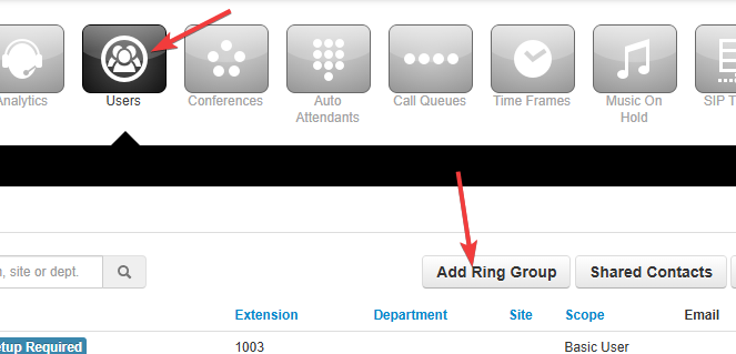 1. Navigate to the the "Users" tab and click on "Add Ring Group"