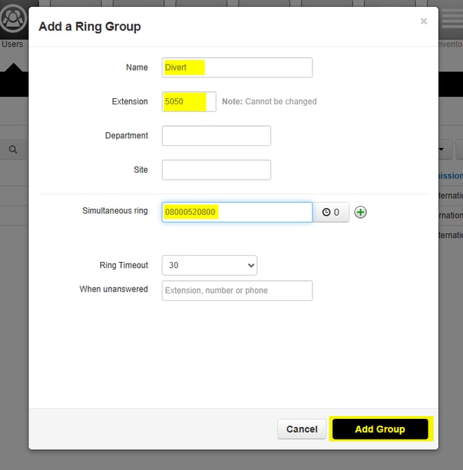 2. Give the ring group a name and extension number (you can also optionally give it a Department/Site). Then click "Add Group".