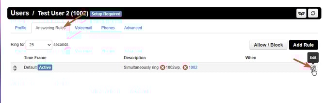 2. Select "Answering Rules" then select "Edit" on the "Default" rule.