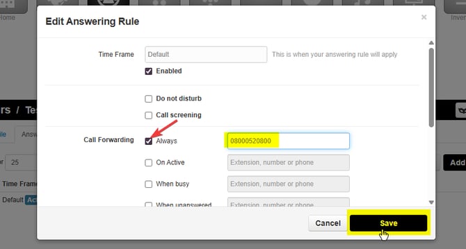 3. Select the "Always" Tickbox and enter the number you want to divert to, then click save.