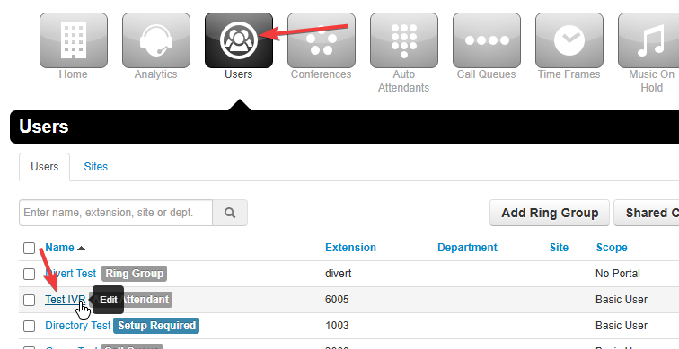 1. Navigate to "Users" and select the Queue/IVR you want to divert.