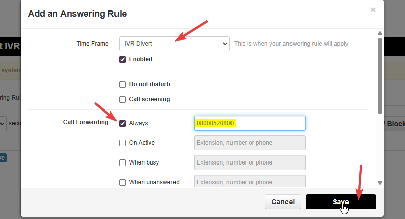 3. Select the time frame you created for the divert at the top of the window, then select the "Always" tickbox and enter the number you want to divert to in the box. When done click "Save".