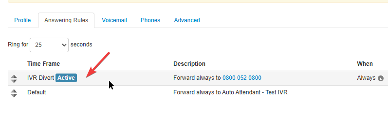 5. Make sure your divert answering rule appears at the top of the list above any other rules, otherwise it will not be active (you can click and drag to move it).